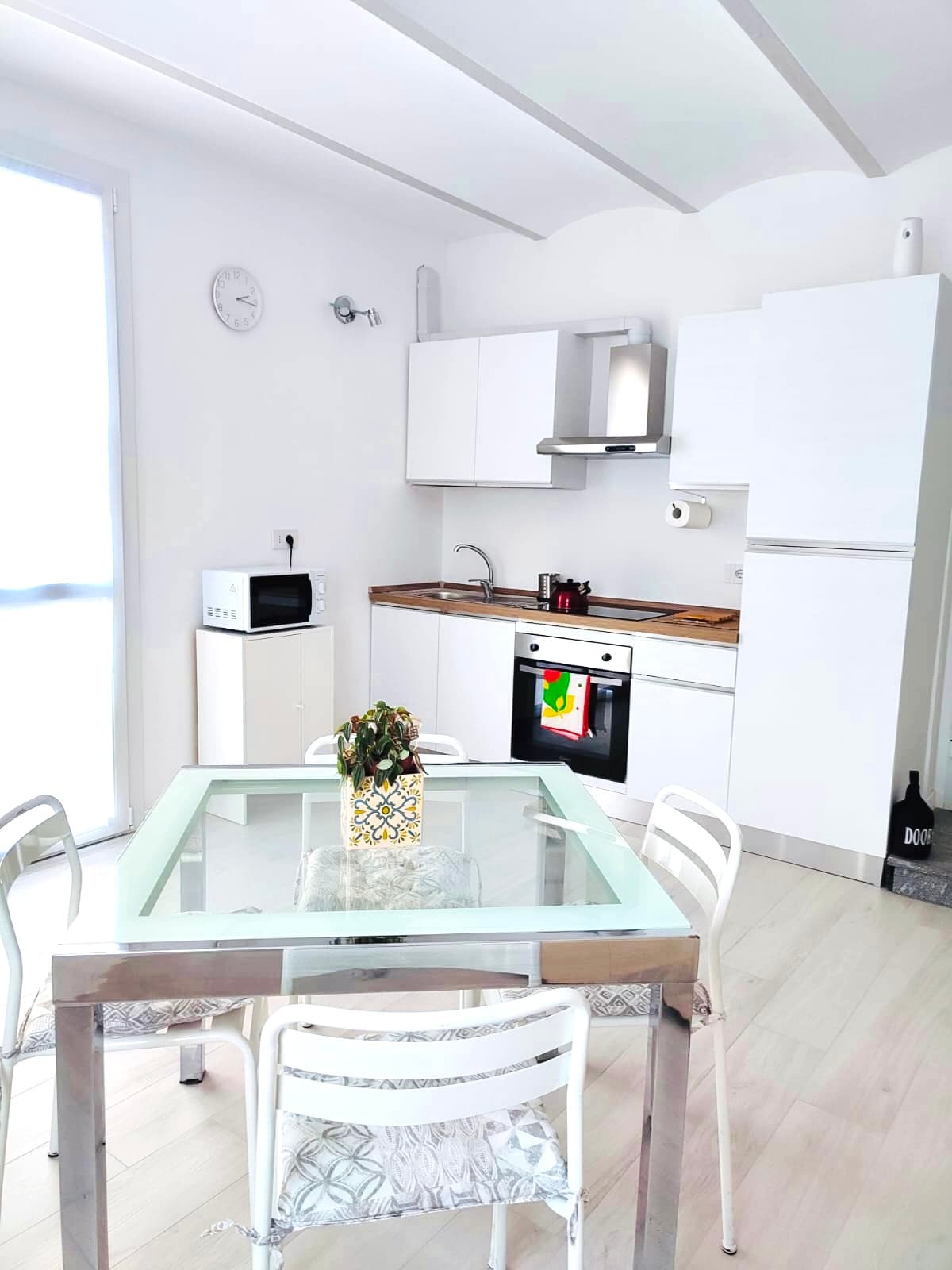 Dom położony kilka kroków od centrum, z bezpłatnym parkingiem na zewnątrz posesji. Parter: ogród, weranda, kuchnia z bardzo dużym salonem/pokojem dziennym/przestrzenią do pracy, łazienka. Pierwsze piętro: gabinet, 1 sypialnia z łóżkiem małżeńskim i duża łazienka z wanną z hydromasażem i podwójnym prysznicem + 1 sypialnia z łóżkiem małżeńskim, obie z wentylatorami sufitowymi. Podłogi z parkietu i kamienia, starannie dobrane meble z kontrastującymi elementami w stylu vintage i nowoczesnymi dziełami artystów-właścicieli.