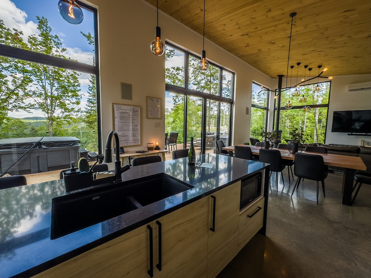 Odpocznij w nowym luksusowym górskim domku nad rzeką L'Assomption. Ten dom o powierzchni 300 m² oferuje oszałamiające widoki na góry, 8-osobowe jacuzzi i salon gier. Wygodne miejsce dla 9 gości, idealne na kameralny wypoczynek zaledwie godzinę od Montrealu i kilka minut od stoków narciarskich. Ciesz się najwyższą jakością, ręcznie wykonanymi detalami i bezpośrednim dostępem do rzeki, aby pobyt był niezapomniany.