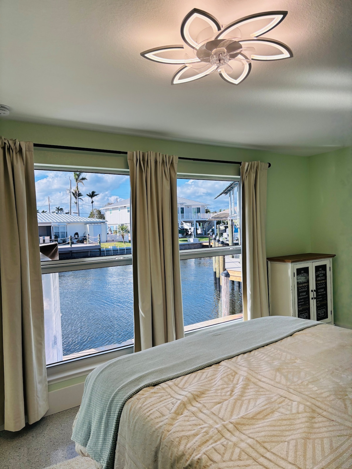 Odkryj wyspę mieszkającą w nowo odnowionym nabrzeżu w Matlacha nad głębokim kanałem wodnym. Ten przestronny dom z dwiema sypialniami i jedną łazienką oferuje wszystkie udogodnienia: klimatyzację, szybki internet i w pełni wyposażoną kuchnię. Idealne dla maksymalnie 7 osób z rozkładaną kanapą typu queen-size. Skorzystaj z zamrażarki w garażu. Pomost jest świetny do cumowania łodzi – podnośnik nie jest dostępny do użytku. Shuffleboard w tylnym salonie rodzinnym. Na werandzie z tyłu domu znajduje się grill gazowy i miejsca do siedzenia, które umożliwiają spędzanie czasu na świeżym powietrzu.