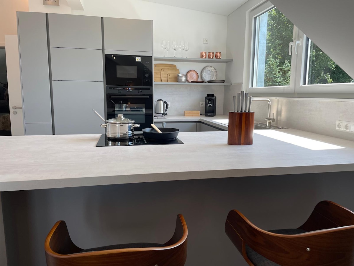Nowoczesny, słoneczny apartament o powierzchni 100 m2, 2 osoby, 1 sypialnia, 1 łazienka z sauną, 1 salon, kuchnia, balkon, bezpłatne miejsce parkingowe. Minimalna rezerwacja: 3 dni Z przyjemnością odbierzemy podróżnych pociągiem z dworca kolejowego Wiesloch. Wygodnie umeblowany apartament na górnym piętrze naszego domu dwurodzinnego ma własne wejście, szeroki widok na wzgórza Kraichgau i spokojną lokalizację w zaułku. Dom jest zasilany energią słoneczną i biogazem do ogrzewania.