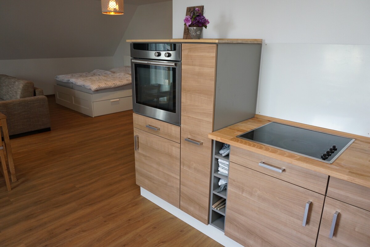 Mały, ale ładny 1,5-pokojowy apartament z prywatnym tarasem, zachwyca kochającymi i nowoczesnymi meblami i może pomieścić do 4 osób. Jasna część dzienna z dwoma wygodnymi łóżkami pojedynczymi, Kuchnia w pełni wyposażona, stół z pięknym widokiem. Telewizor z Chromecastem Podwójne łóżko na strychu duża łazienka z prysznicem (ręczniki wliczone w cenę) Taras, grill, (kominek można zarezerwować) sep. Wejście, 2 bezpłatne miejsca parkingowe Dostępne bezpłatne Wi-Fi