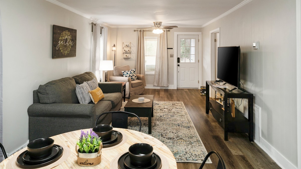 Przytulny domek parterowy z 3 sypialniami i 1,5 łazienki, zaledwie 5 minut spacerem od restauracji, sklepów i barów w centrum Belmont. Udogodnienia obejmują w pełni zaopatrzoną kuchnię z dużą przestrzenią na blacie, Keurig, pralnię, szybkie Wi-Fi i 60-calowy telewizor Smart TV z Netflix. Wygodnie może się tu zmieścić 6 osób, z 1 łóżkiem typu queen, 1 pełnym i 2 pojedynczymi łóżkami. Idealne na przytulne noce lub weekendowy wypad – tylko 13 minut do lotniska i 20 minut do Charlotte, co zapewnia szybki dostęp do miasta z małomiasteczkowym urokiem.