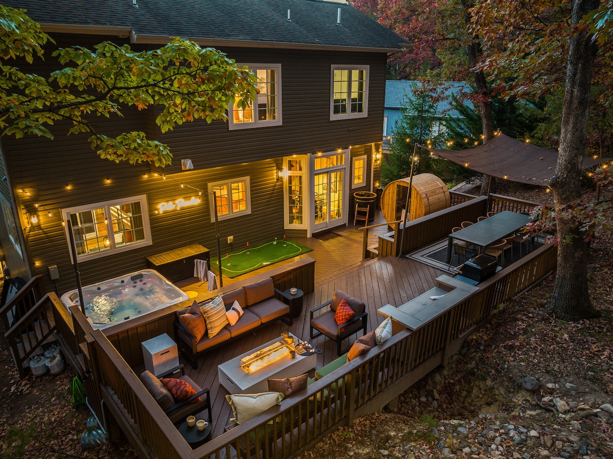 Szałas na drzewie w Massanutten Resort. Zrelaksuj się przy wewnętrznym palenisku gazowym, zanurz się w prywatnym jacuzzi i śpiewaj na karaoke. Wyjątkowa nowoczesna chata z połowy wieku od CampfireLodges. Rozrywka: telewizory 360°, telewizor w każdym pokoju, super szybkie Wi-Fi Kucharz: kuchnia szefa kuchni poza pokojem (trzymaj grupę razem!) – bar kawowy i grill na pokładzie ~5 minut do nart, parków wodnych, golfa, restauracji i winnic – a jednak spokojnie wśród sosen. Zarezerwuj teraz, zanim Twój termin zniknie!