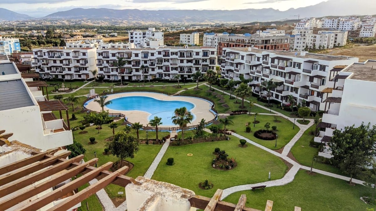 Witamy w naszym stylowym 2-pokojowym Airbnb w Cabo Negro! 6 miejsc (w tym dla niemowląt) z pełną kuchnią, szybkim Wi-Fi, 2 telewizorami Smart TV, balkonem i wszystkimi niezbędnymi akcesoriami dla rodziny (łóżeczko, wysokie krzesełko). Zaledwie kilka minut od plaży, pola golfowego i 3 dużych basenów – idealne na słoneczne wypady, wycieczki golfowe lub pracę zdalną. Pięknie zaprojektowane z myślą o komforcie, obsłudze i relaksie. Uwaga: zgodnie z prawem marokańskim zakaz imprez, spożywania alkoholu, palenia tytoniu i przyjmowania par niebędących w związku małżeńskim.