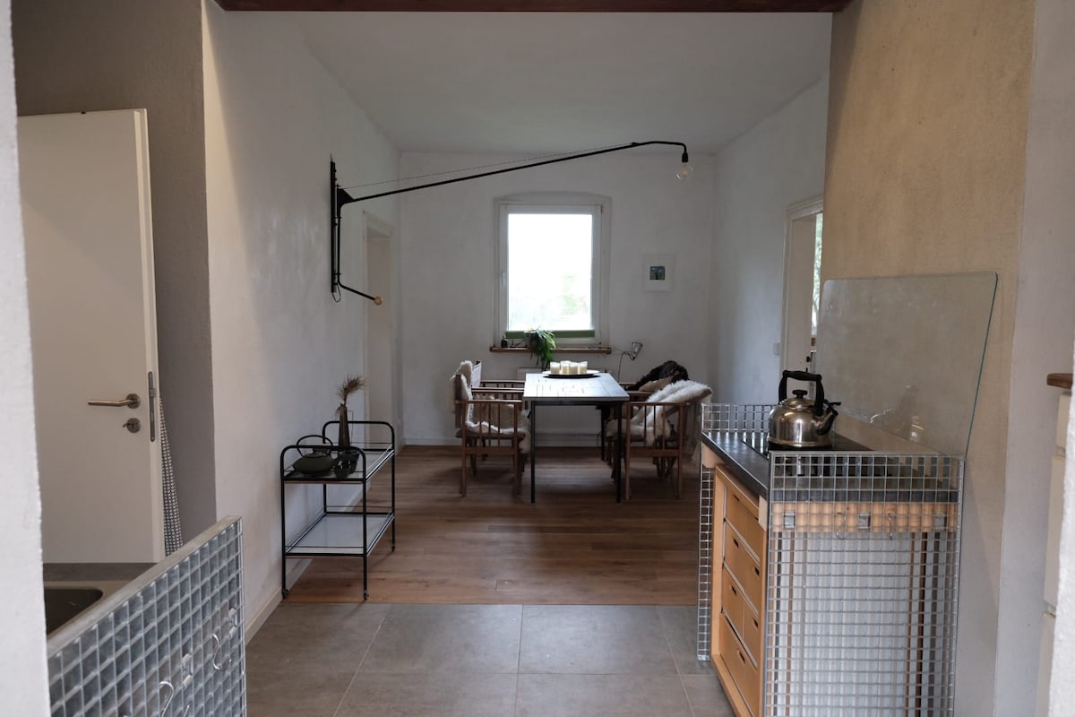 Neben einem alten Pfarrhaus haben wir ein kleines Nebengelass individuell für uns, für Freunde und Gäste ausgebaut. Manches ist modern, anderes hat noch den Charme vergangener Zeiten. Vieles erscheint uns stimmig, einiges ist noch im Werden. Nix ist also Standard. Was noch nicht von uns bedacht und für Gäste sinnvoll ist, kann meist schnell ergänzt werden. Das Häuschen ist umgeben von einem naturbelassenen Garten an der Ackerkante, liegt also in einem kleinen, landwirtschaftlich aktiven Dorf.