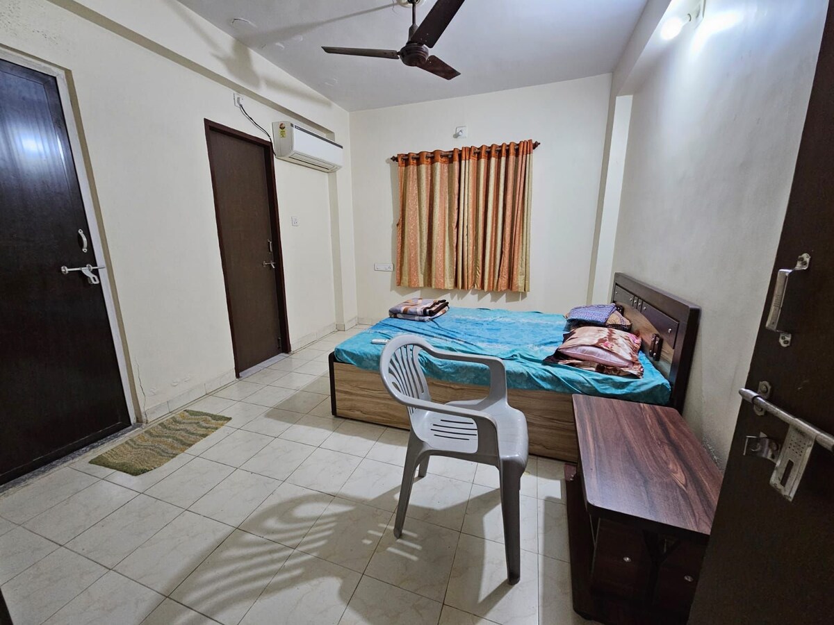 This flat is master bedroom and a small bedroom equipped with fully utilitarian kitchen, study and lounge area is available for a peaceful and a long term stay. Extra bedding space and equipment is also available. 5kms from airport. 1kms from 2 separate malls. 2 kms local market 1.5 kms is a multi speciality hospital