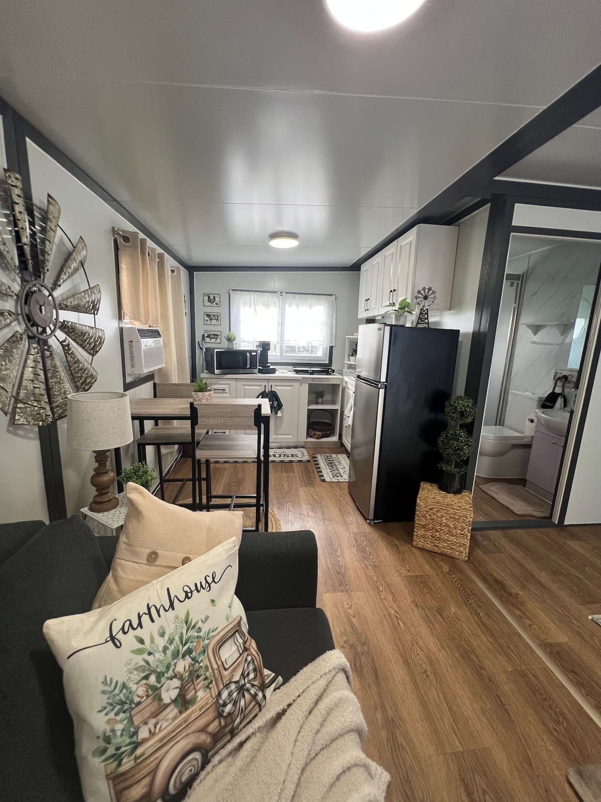 Pięknie zbudowany i urządzony domek Harmony Tiny znajduje się w pobliżu jeziora Newnan, ale tylko 10 minut jazdy od centrum miasta. Otoczony lasem z trzech stron, znajduje się za głównym domem na akrze ziemi z małym strumieniem z tyłu. Masz dostęp do podwórka ze stołem i krzesłami na świeżym powietrzu, a także klucz do pomieszczenia gospodarczego, jeśli musisz zrobić pranie. Przesuwne szklane drzwi wejściowe wychodzą na podwórko. Należy pamiętać, że zwierzęta są mile widziane, a opłata za zwierzę wynosi 30 USD.