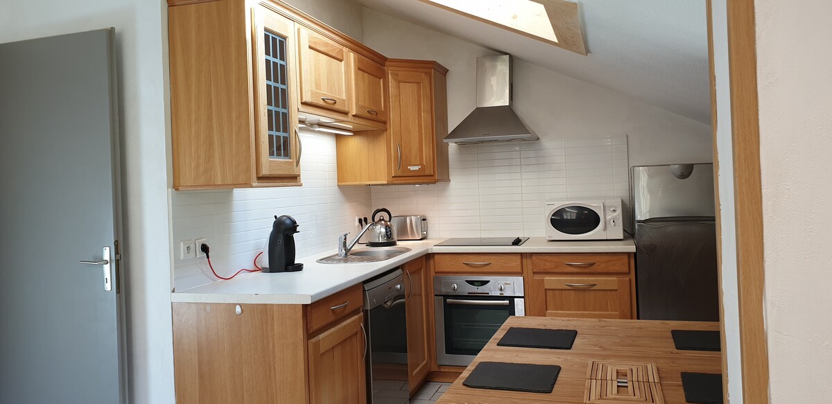 Appartement calme, idéal en famille, 4 ou 5 pers., tout confort, très bien équipé et décoré. Pkg gratuit. Vue sur les montagnes depuis la terrasse et plain pied sur la verdure. Expo S-S0. Entrée avec rangement, pièce de vie avec cuisine équipée et séjour canapé lit, une chambre séparée : juste un lit double (de très bonne qualité) et un lit simple superposé), sde et wc séparés. Coût ménage et draps de lit obligatoire. Casier à ski et rangements. Un garage peut être disponible en supplément
