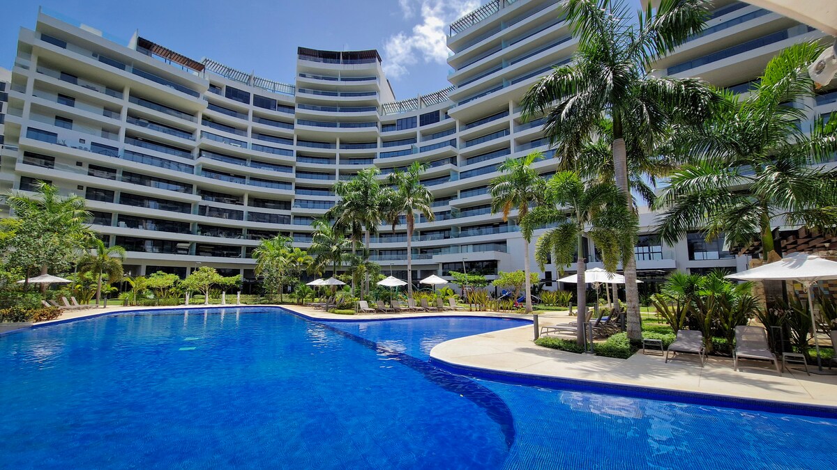 Piękne apartamenty z przodu Plaza la Isla, z uroczym tarasem z widokiem na jezioro wewnątrz ekskluzywnego kompleksu Cabo Norte. Posiada sypialnię z łóżkiem typu Queen oraz studio z rozkładaną sofą. Wi-Fi ma prędkość 300 MB, znajdziesz tu wiele luksusowych udogodnień, takich jak basen, siłownia, sala gier, rowery, miejsce na grilla, taras na 19 piętra. Ponadto znajduje się tuż przed Plaza La Isla. Prawdziwie przytulne mieszkanie, będziesz się w nim czuł bardzo komfortowo.