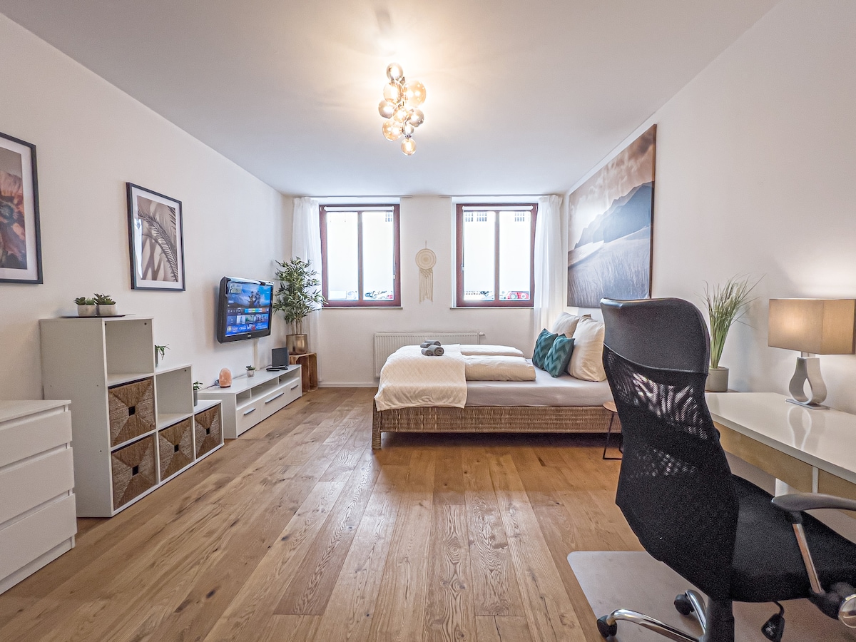 Witaj w KERA Stay! W samym sercu Merseburga, tuż na rynku, znajdziesz stylowo urządzony apartament ze wszystkimi udogodnieniami do pracy i relaksu. Niezależnie od tego, czy jesteś mechanikiem, osobą podróżującą służbowo, czy na wakacjach – tutaj znajdziesz idealne połączenie funkcjonalności, przytulności i lokalizacji. Najciekawsze: nowoczesna kuchnia, szybkie Wi-Fi, wygodne łóżka i wszystko w odległości spaceru – od restauracji po supermarket. Idealne połączenie z Leuna, Halle, Lipsk i lotniskiem.