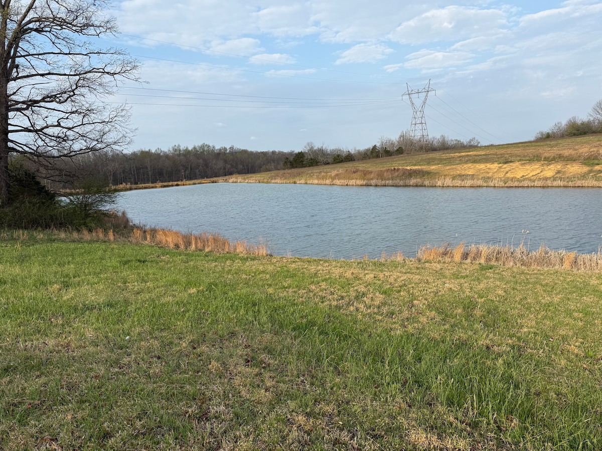 Take it easy at this unique and tranquil getaway. LUSH wooded backdrop of huge oak trees! a 400+ year old oak tree in the back yard. (Bedroom 2) the upstairs is small with 2 beds a low 4 foot sloping to 3foot ceiling height. Farm view out every window. This is a grain and cattle working farm. S Fork of the Little Barren River is great to kayak on in the rainy season (spring), walk it to fish in the dry months. This house was built in 1940s. Wildlife abounds! Wrap-around porch.