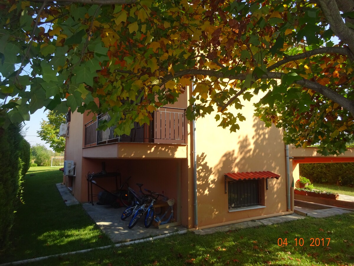 Piękna letnia atmosfera tego przestronnego mieszkania ogrodowego. 1 sypialnia z dwuosobowym łóżkiem, otwarty plan części mieszkalnej, duża kuchnia . Blisko wzgórz Meteora z panoramicznym widokiem na miasto i skały. Położony w spokojnym i cichym miejscu. Dużo okien i naturalnego światła słonecznego ~ zachwyca widokami lub wybierz się na krótki spacer po legendarnej ścieżce pieszej Holly Trinity. Jesteśmy 15 minut spacerem do centrum miasta i 15 minut spacerem Dziewicy Maryi Starożytnej świątyni.