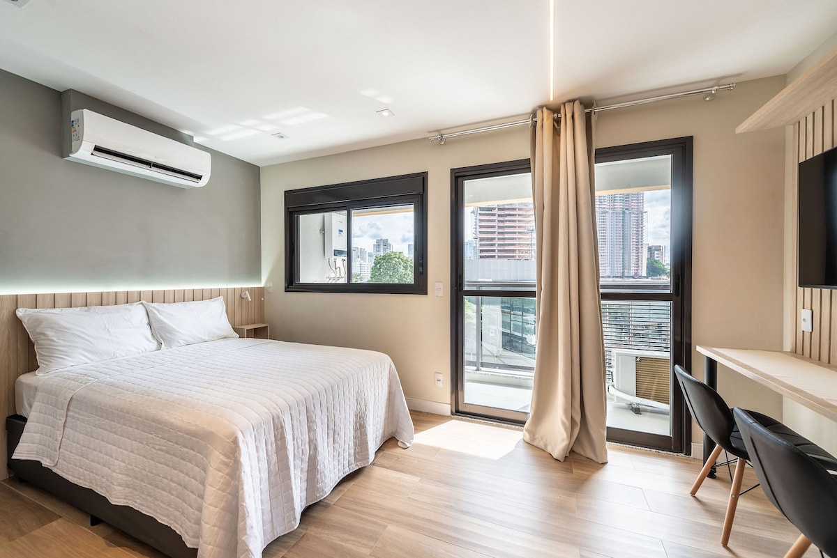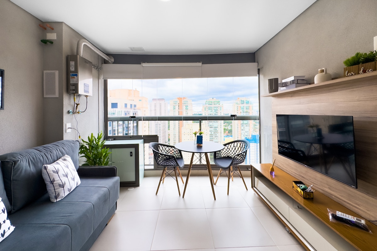 Nowoczesne studio z meblami w stylu klasycznym, dobrze urządzone, wygodne, super dobrze położone i z klimatyzacją! Samodzielne zameldowanie. Przed stacją metra Brooklin (wystarczy przejść przez ulicę), w pobliżu centrum handlowego Morumbi, sklepów Carrefour, Pão de Açúcar, piekarni, restauracji. Wszystko można zrobić na piechotę! Zamknięty balkon. Telewizor, Netflix, Wi-Fi, balkon, zaciemniające zasłony i pralka. Nie przyjmujemy palaczy i zwierząt