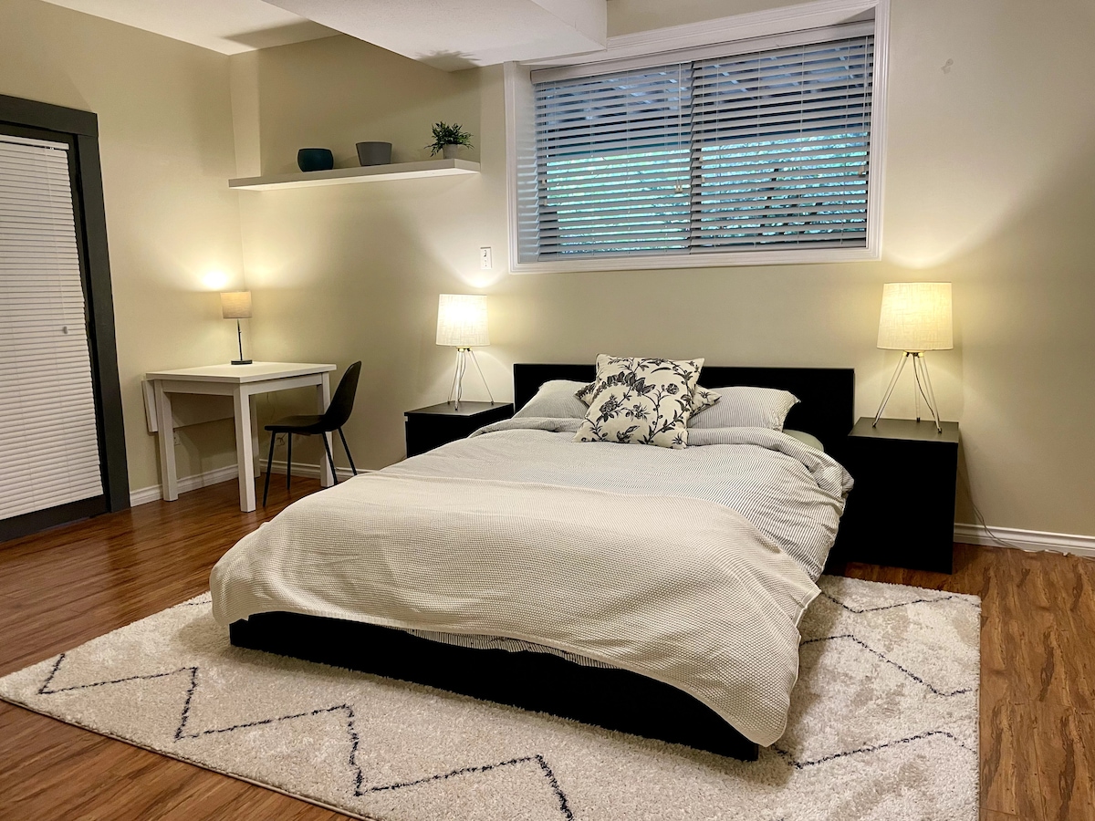 Welcome to your ideal North Vancouver retreat! This bright and spacious 1,110 sq. ft. ground-floor suite features a private entrance, a king bedroom, a versatile den, and a sleek modern bathroom. Nestled in a peaceful, safe neighborhood, you're just minutes from Grouse Mountain, Capilano Suspension Bridge, and Cleveland Dam. Thoughtfully designed with brand-new furnishings, a full laundry room, and all the comforts of home. Transit is only a 4-minute walk away. Unwind and make yourself at home!