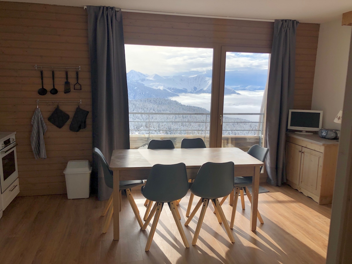 Studio 28 m2 z widokiem na stoki, narty na wyciągnięcie ręki. ESF, wyciągi narciarskie, sklepy tuż obok. Apartament jest w pełni wyposażony: Wi-Fi, duży telewizor, sprzęt hi-fi, odtwarzacz DVD, urządzenia do raclette i fondue, ekspres Senseo, zmywarka, mini piekarnik, kuchenka mikrofalowa, czajnik, toster. Dostępne są środki czystości, olej, ocet, cukier, sól, pieprz. Możliwość wypożyczenia pościeli: 10 euro za osobę. Bezpłatny autobus w sezonie letnim, zimowym: przystanek w odległości 50 m. Kaucja: 100 euro