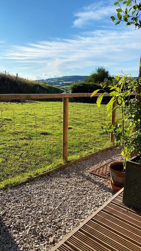 Duża, przytulna rustykalna 1-pokojowa chatka z oddzielnym prysznicem elektrycznym, toaletą i aneksem kuchennym. Duże łóżko. Oszałamiające widoki na okolicę, położone w prywatnym padoku dla zwierząt na szczycie naszego ogrodu. Fantastycznie nadaje się do spacerów z psem. Znajduje się na wiejskiej drodze w AONB. Położony między 2 wioskami z pubami i sklepami, do jednej można łatwo dojść na piechotę, ale zaleca się samochód lub rowery. Znajdujemy się między północnym i południowym wybrzeżem, więc w pobliżu są wspaniałe plaże, a także dwa parki narodowe, Exmoor i Dartmoor.