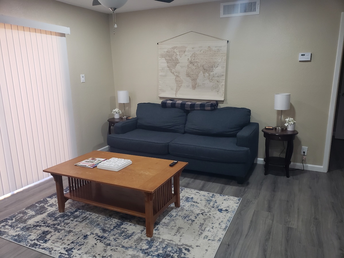 Przestronne mieszkanie z 1 sypialnią i 1 łazienką z otwartym planem kuchni/jadalni/salonu. Nasze mieszkanie jest świeżo odnowione i oferuje bezpłatne Wi-Fi, nowe urządzenia, kuchenkę mikrofalową, świeżą pościel i ręczniki, a także dodatki znajdujące się w szafie z żelazkiem/deską do prasowania. W każdym pokoju znajduje się łóżko typu Queen, biurko oraz telewizor Amazon Fire Smart TV z pilotem, który umożliwia dostęp do wielu aplikacji streamingowych. Małe patio znajduje się poza salonem, gdzie parking jest wyraźnie widoczny, aby zobaczyć pojazd. Pralnia na miejscu w odległości krótkiego spaceru.