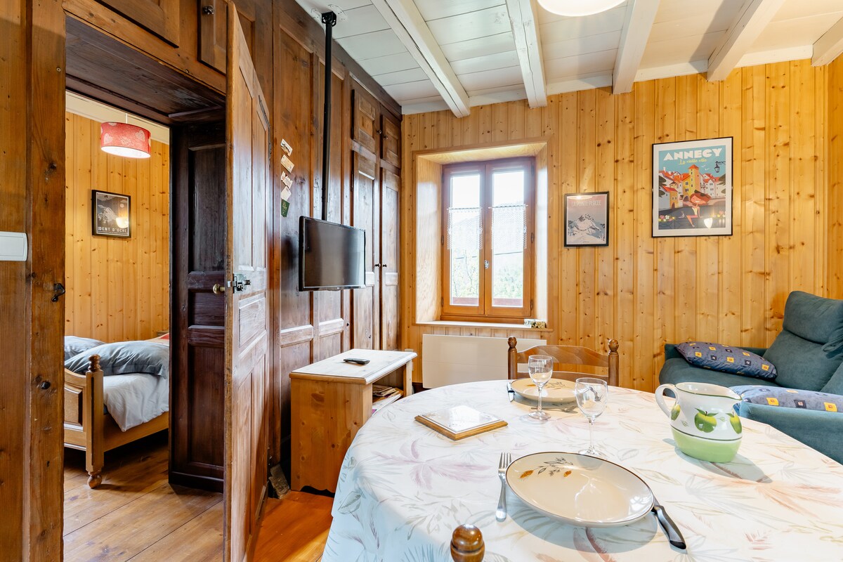 Odnowione mieszkanie położone w małej rezydencji rodzinnej w samym sercu starej wioski Taninges. Obejmuje salon z rozkładaną sofą i wyposażoną kuchnią, sypialnię, łazienkę i oddzielną toaletę. Możesz podziwiać wspaniały widok na Foron, park zamkowy i szczyt Marcelly. Sklepy i usługi w pobliżu. Świetne na komfortowy pobyt między naturą a dziedzictwem.