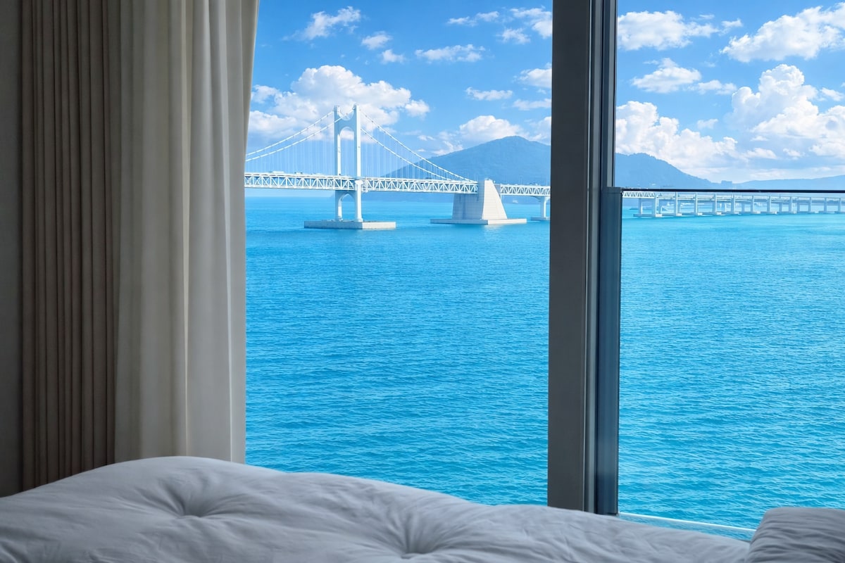 Pełny widok na Ocean i Most Gwangan / Pościel hotelowa / Miejsce na wypoczynek / Maksymalnie 6 osób / 2 sypialnie / 1 salon / 3 łóżka / Woda butelkowana / Bezpłatny parking