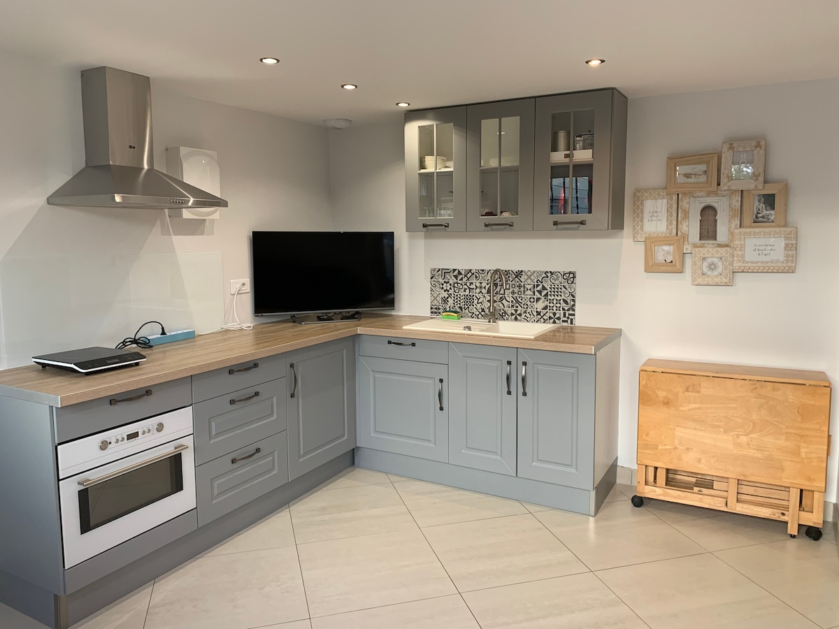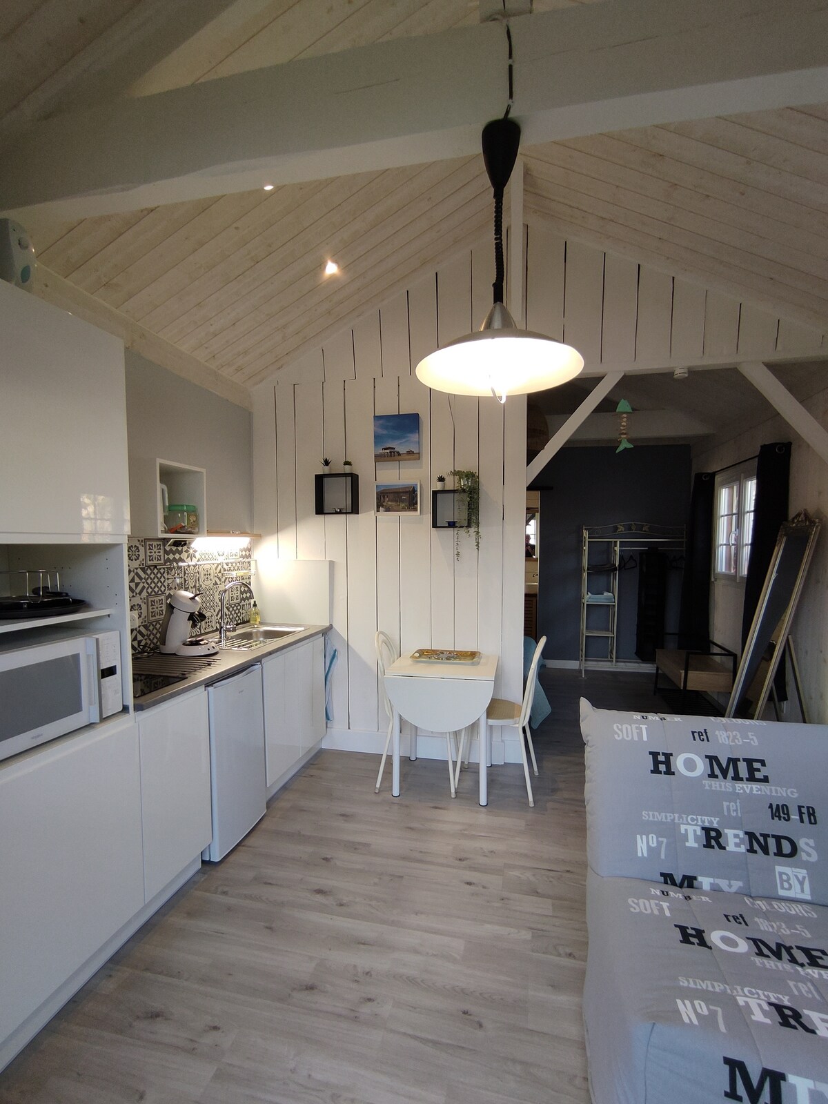 Urocze małe studio składające się z antresoli z łóżkiem i rozkładaną sofą w części dziennej oraz kuchni z lodówką, kuchenką mikrofalową i płytą indukcyjną. Znajduje się 3 km od centrum miasta Andernos i plaż w zatoce Arcachon, 10 km od plaży Grand Crohot w miejscowości Lège Cap Ferret, 50 minut od Bordeaux lub wydmy Pilat. Możesz skorzystać z tego miejsca, aby popływać, pospacerować, pofalować lub zwiedzić Bordeaux i zamki Médoc.