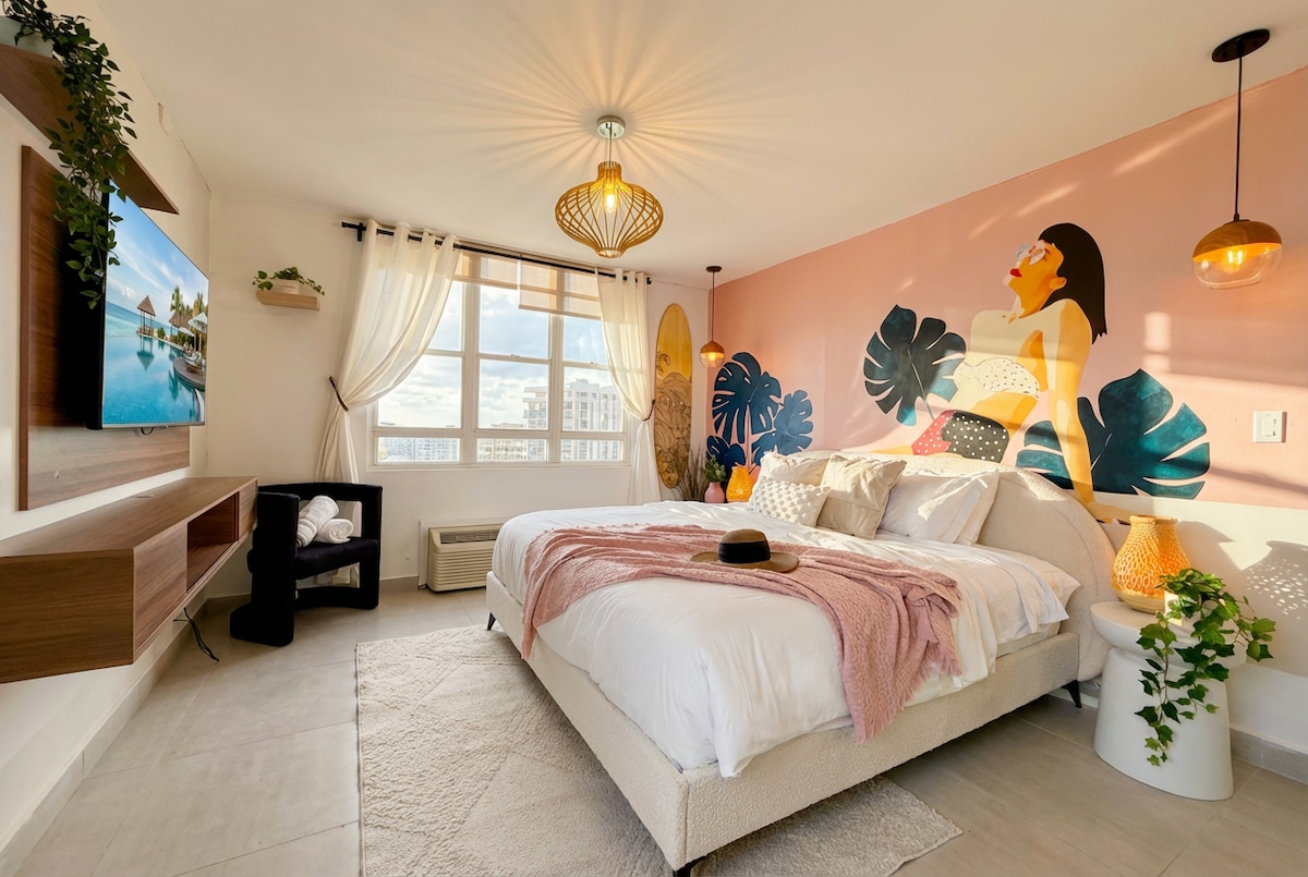 Enjoy a chic, renovated 1BR apartment in the heart of Santurce—perfect for women travelers and weekend couples. Features restored Spanish tiles, high ceilings, comfy beds, blackout curtains, cold A/C, and a full bathroom. Full kitchen, fresh linens, and essentials included. Secure building with self-check-in and free private parking. Common areas are monitored with cameras. Walk to Condado Beach, La Placita, cafés, and museums. Close to Old San Juan, the cruise port, and the airport.