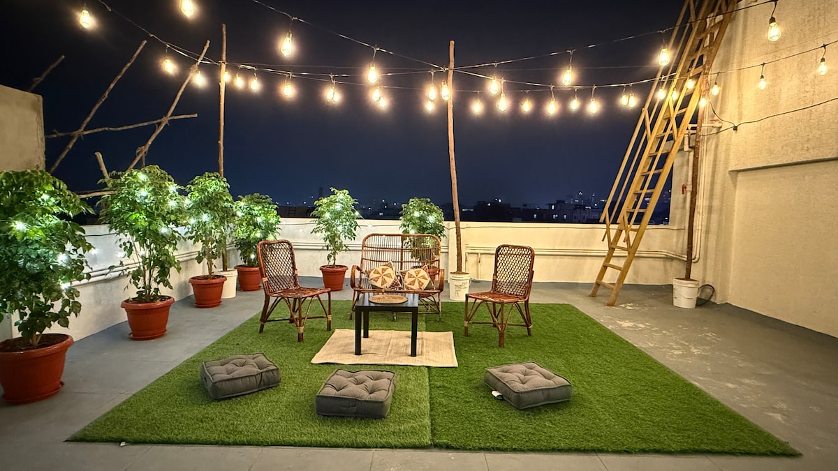 🗝️ Sekretny dom na szczycie 🌇 Oświetlony słońcem kokon na dachu, otoczony ciepłem i szeptem. Miękkie zasłony, lampki i złote narożniki ✨ Przestrzeń, która pozwala odetchnąć głęboko 🌿 📍W samym sercu Kondapur – W pobliżu Sarath City Mall, Shilparamam i ogrodu botanicznego 🌸 Zaledwie 10 minut do HITEC City 💻 Dla zakochanych, marzycieli i osób pracujących zdalnie ☕🧘♀️ Zostań w domu i zrelaksuj się. Pozwól ciszy pozostać z Tobą. 🌙🍃