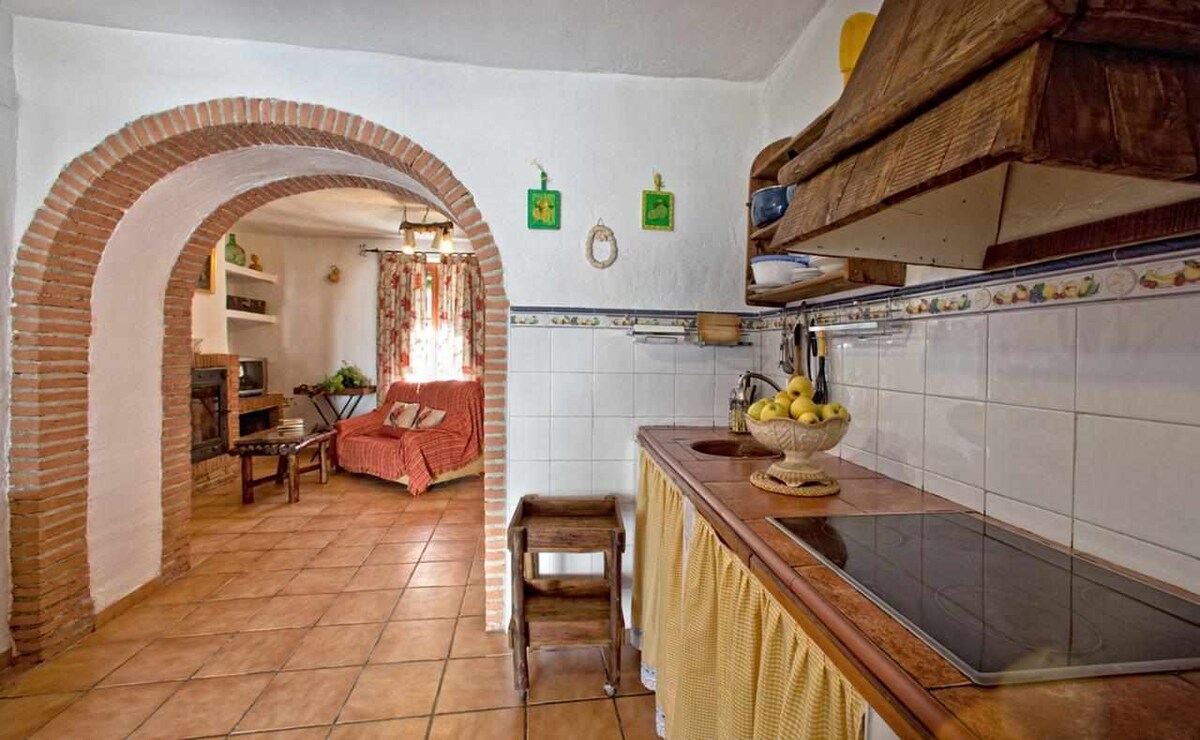This house is characterized by its interior patio with a private pool and barbecue. The table with chairs under the porch invites you to enjoy the outdoors, while the 2 hammocks are perfect for soaking up the Andalusian sun. Inside, the bedroom features an extra-large bed, with the option of an extra bed or crib. The living room, adorned with local craftsmanship, has a sofa, Smart TV, and a fireplace (firewood included in the price). The living room opens up to the fully equipped kitchen.