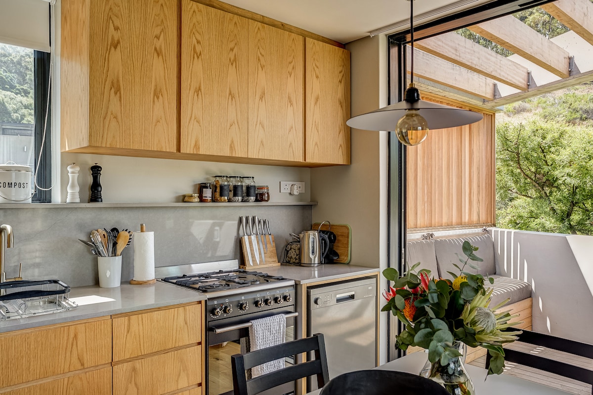 Stay at Cyphia Close Cabins in Hout Bay, in a unique, architect designed pod with magnificent outdoor spaces, sea & mountain views, surrounded by beaches, sand dunes, mountains & fynbos, while still close to town & CBD Featuring a twin/king bed(s), bathroom, living area, kitchen, deck & wood-fired outdoor bath Internet:500MB down/250MB up. Inverter for loadshedding Not secluded; we have other cabins and we have animals onsite No free stays for social media posts Please read full listing