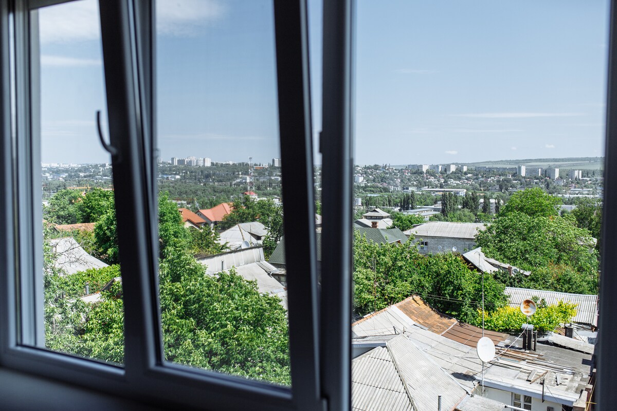 Apartament modern cu o cameră, complet utilat, situat în centrul Chișinăului, lângă un parc liniștit. Ideal pentru relaxare sau lucru la distanță. Wi-Fi rapid, bucătărie echipată, aer condiționat și acces facil la transport, restaurante și magazine. Perfect pentru cupluri sau călătorii solo.