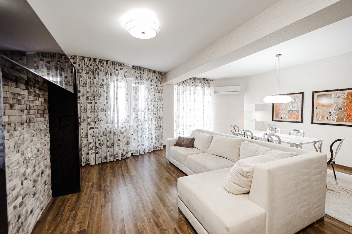 This apartment is the ideal base for your stay in Chișinău, offering a space that’s both comfortable and inviting. With a fresh, modern design, each room is crafted to help you feel at home, whether you're here for a weekend getaway, a family trip, or business. The layout is flexible, making it easy to relax or get things done, and just steps away from the best the city has to offer. Whether you're unwinding or exploring, you’ll have everything you need for an effortless stay.