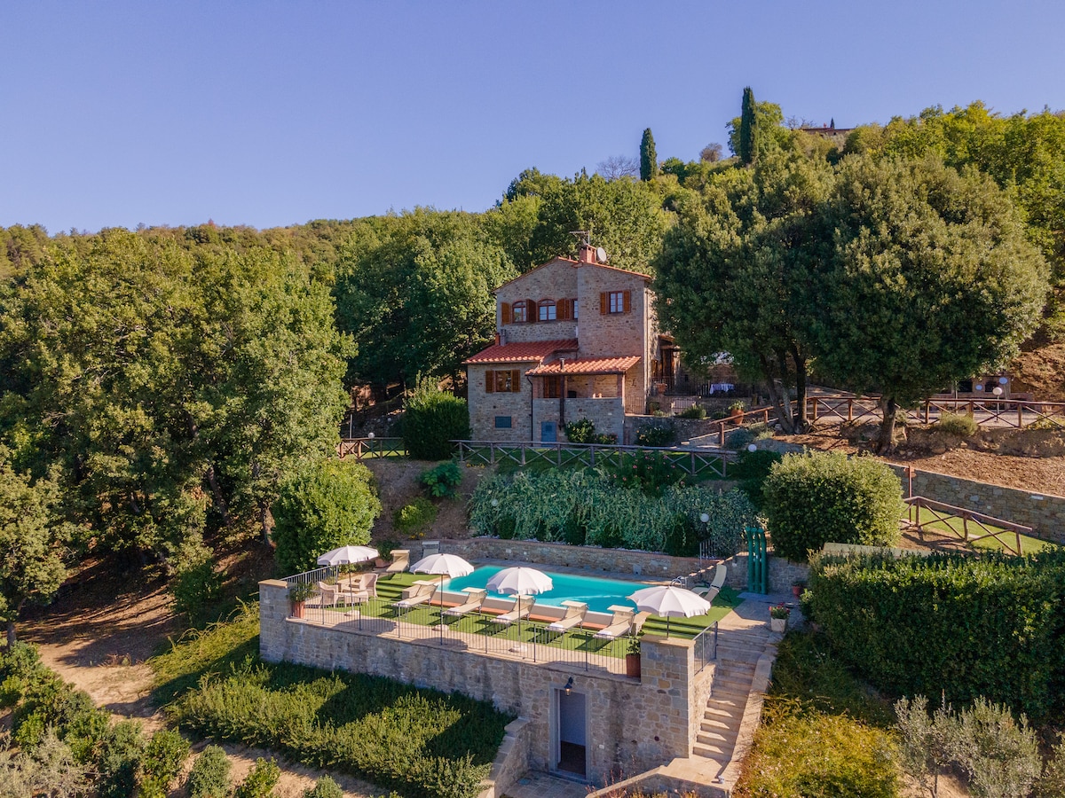 W urokliwej toskańskiej wsi, pośród gajów oliwnych i winnic, kamienna willa, w idealnym miejscu, aby odkryć tajemnice Toskanii i Umbrii klimatyzacja i basen z centrum odnowy biologicznej dla Twojego relaksu i komfortu Villa Senaia to duży dom z belkami stropowymi, położony w pięknej okolicy na wzgórzu z idyllicznym widokiem na jedno z ulubionych miejsc toskańskiej wsi, atrakcyjne miejsce do spożywania posiłków na świeżym powietrzu, picia toskańskiego wina i słuchania cykania świerszczy i cykad.