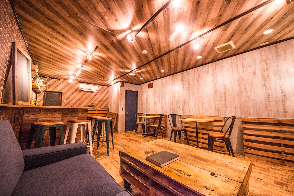 Domek gościnny z najfajniejszym sklepem barowym. Wszystkie miejsca są zarezerwowane. 2-minutowy spacer od dworca, obok FamilyMart. Napij się w kawiarni z sofą i podwójnym łóżkiem. Możesz obejrzeć filmy, Netflix, youtube i muzykę, podłączając je do komputera z projektorem i kablem HDMI. Duży telewizor i koralowe poduszki do stylowej jadalni z kuchnią i relaksującym salonem. Sypialnia jest wyposażona w podwójne łóżko. Jest tu również grzejnik gazowy, więc zimą jest ciepło.