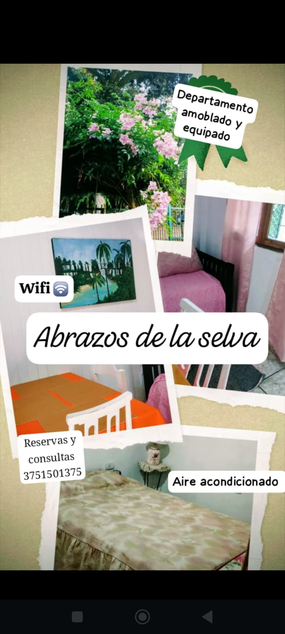 Este departamento se encuentra en el centro de la ciudad de Eldorado; cercano a todos los puntos de interés; es muy amplio y cuenta con todo lo necesario para garantizar una excelente estadía. Dispone de un luminoso living comedor con salida al patio interior, donde también puede disfrutar del aire libre en pleno centro de la ciudad; el departamento incluye microondas, horno, extractor, televisor, heladera, batería de cocina, etc. Se destaca el patio con plantas tropicales con mesa y sillas.