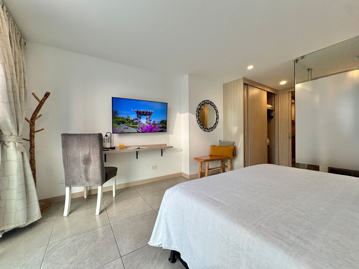 Ciesz się stylowym doświadczeniem w tym centralnie położonym apartamencie. Pamiętaj, że chociaż nie mamy parkingu na terenie kompleksu, w odległości jednego lub dwóch bloków znajduje się kilka opcji! - Sieć supermarketów w centrum handlowym. - Łatwy dostęp do parku kawowego, Panaca, Salento, Filandia i wszystkich atrakcji Quindio. - Bardzo wygodne łóżka - Ciepła woda - Okno dźwiękoszczelne - Pokój wielofunkcyjny (biuro, sypialnia, siłownia)