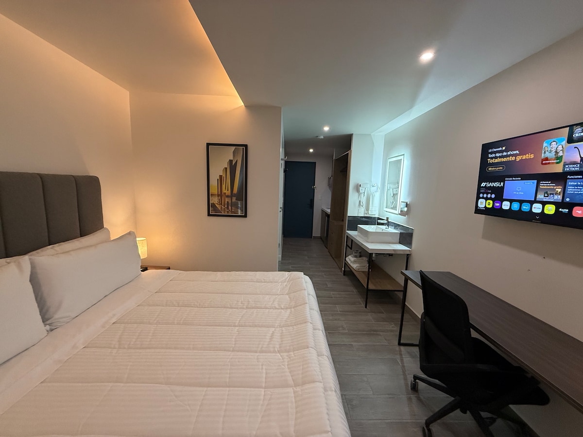 Disfruta de una experiencia única en nuestra acogedora suite, ubicada a solo unos pasos del histórico Barrio Antiguo y el vibrante centro de Monterrey. Está suite está cuidadosamente diseñada para brindarte el máximo confort. Perfecta para quienes buscan una estadía íntima en un ambiente relajante, rodeados de la cultura y energía de la ciudad.