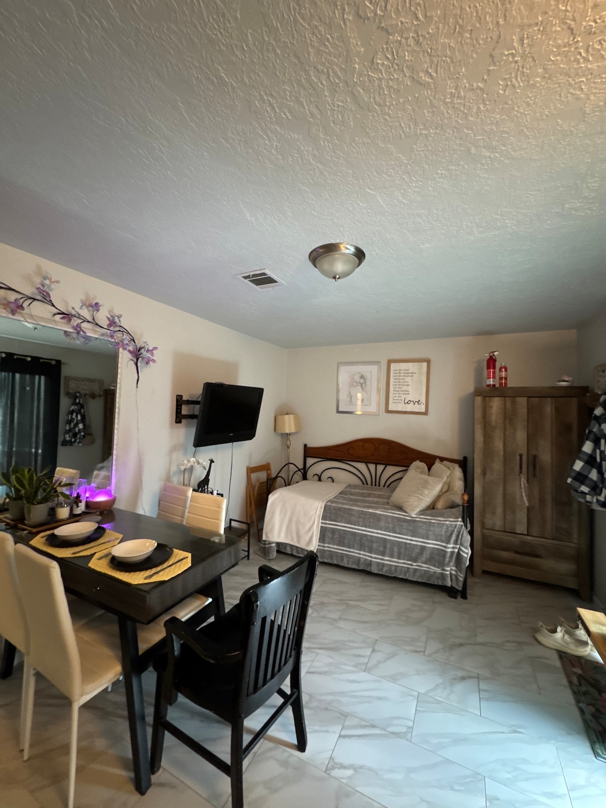 One room guesthouse with queen size bed and futon couch in quiet neighborhood close to all the amenities Lake Conroe and the historic Montgomery area has to offer. Roku TV and internet, small fridge, a/c and bathroom with shower. Cameras on premises outdoors only. Smoking allowed outside only. Early check in may be available upon request. NO TRAILERS. Wedding venues 20 minutes away or closer 20 min to RenFest 25 miles from The Woodlands 45 miles from Bush Intercontinental Airport