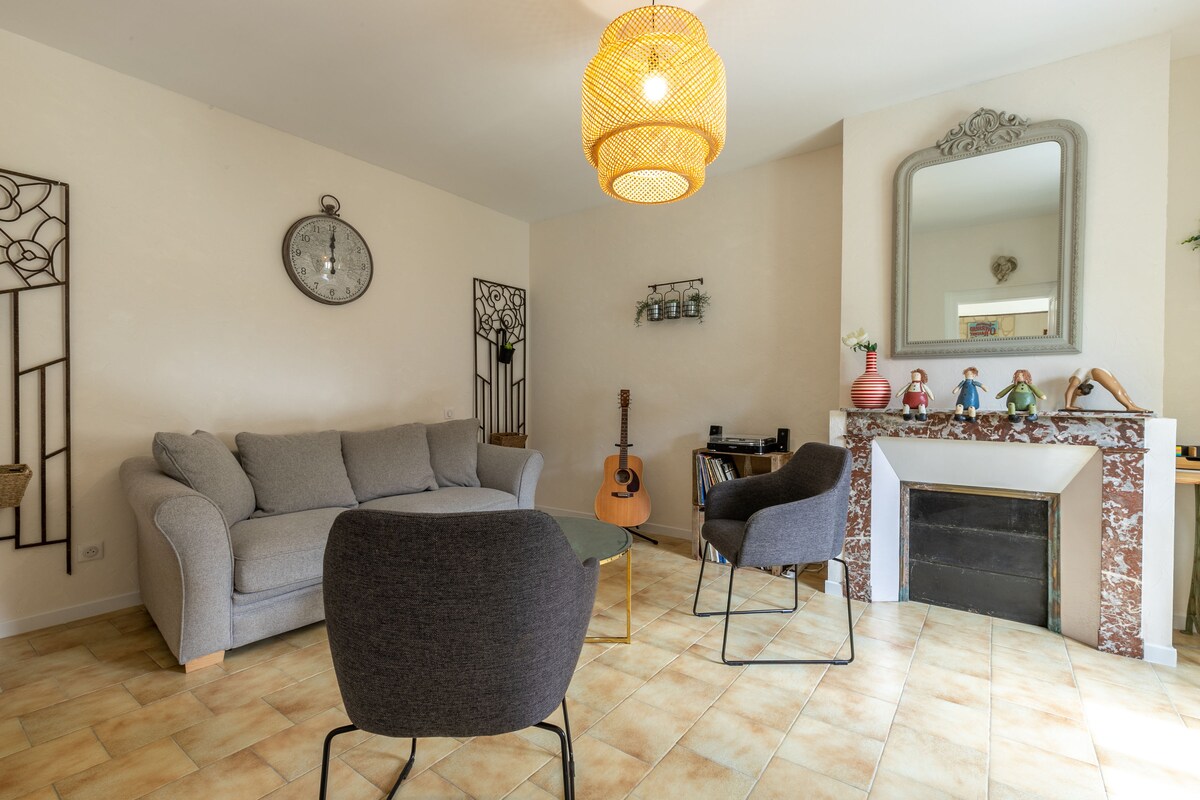 W 1 domu z XIX-WIECZNYM urokiem, 1 domek dla 1 rodziny 4 osób, odnowiony, całkowicie niezależny, bardzo dobrze wyposażony, z ogrodem, tarasem (grill) i prywatnym miejscem parkingowym. Składa się z 1 salonu o charakterze 30m2 z 1 wyposażoną kuchnią, 1 jadalni i 1 telewizora (pudełko), 1 sypialni podwójnej (160 łóżek), 1 małej sypialni dla 2 młodych osób (2 pojedyncze łóżka), 1 łazienki z toaletą, 1 pokoju w Velos. Wyposażenie dla dziecka na życzenie. Łóżka są przygotowywane po Twoim przyjeździe
