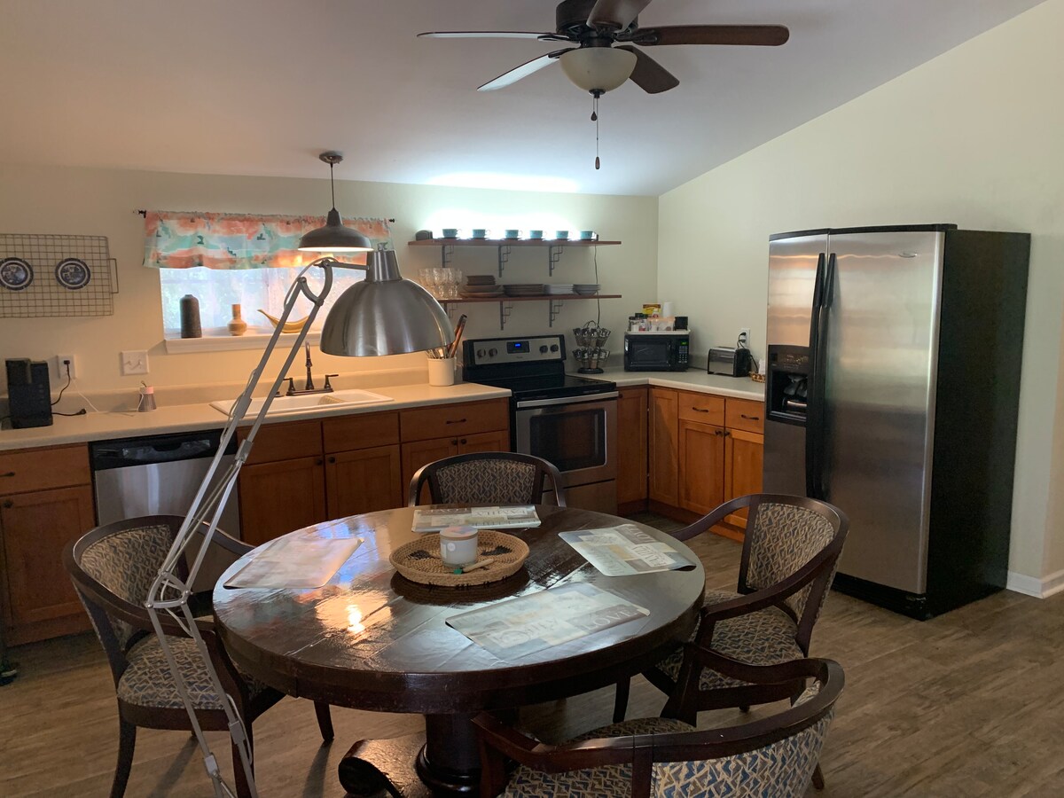 Zrelaksuj się i odpręż w tym pięknie odnowionym domu z 4 sypialniami i 3 łazienkami, położonym na 20 akrach idealnych dębów, organicznych sadów jagodowych i obfitej przyrody. Jest tu wiele miejsc do rozrywki, w tym duży basen z podgrzewaną wodą (podgrzewany od marca do listopada). Jest w pełni wyposażona kuchnia, luksusksowe łóżka i pościel hotelowej jakości. Każdy pokój ma telewizję kablową i internet w całym domu.