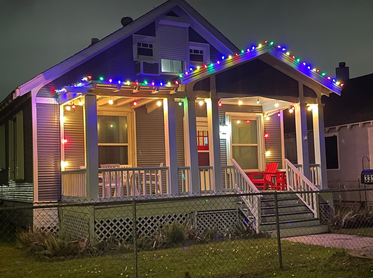 Położony w centrum, ten mały klejnot znajduje się 1 przecznicę od trasy parady Mardi Gras, około 3 minuty od plaży, w pobliżu Pleasure Pier i statku wycieczkowego, barów, lokali, restauracji i UTMB! ~Zadaszone, zewnętrzne obszary z grillem, paleniskiem i huśtawką na świeżym powietrzu idealne na relaks wieczorami To 2 łóżka, 1 łazienka, wygodnie może pomieścić 6 osób: 1 łóżko typu queen size, 1 pełnowymiarowe łóżko i 1 sofa typu queen size.