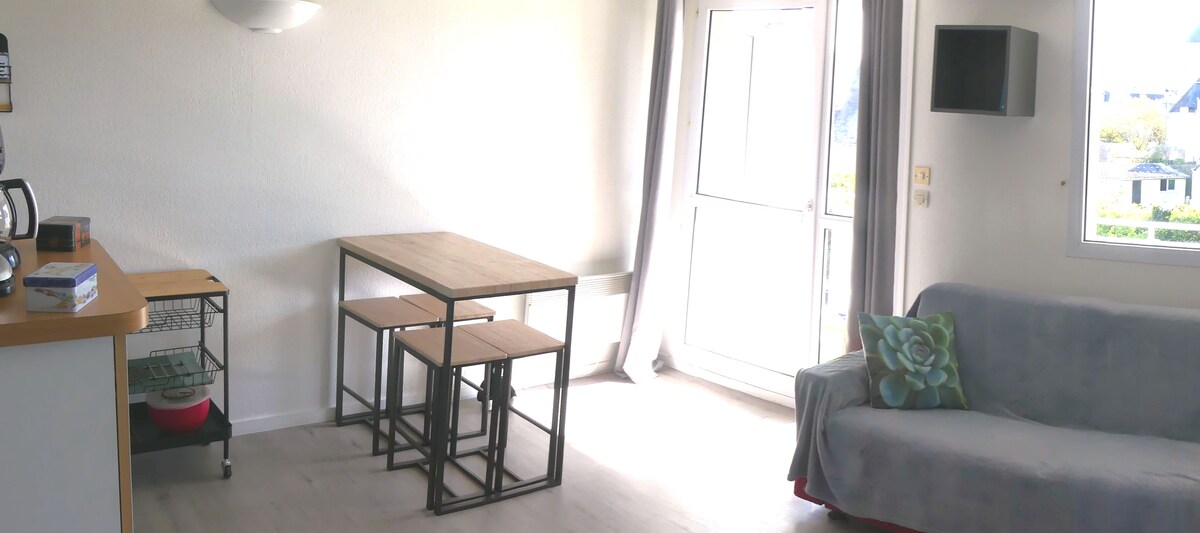 Niezależne studio, poddasze, w pobliżu dworca kolejowego Pouliguen, na 3 piętrze bez windy, 2 okna dachowe, jasne, niedawno odnowione. Część sypialna z podwójnym łóżkiem (140x190), 2 szafkami nocnymi i szafą/regałem, 1 łazienka z prysznicem, umywalką, toaletą. Kuchnia z stołem, lodówką, dwupalnikową płytą ceramiczną, kuchenką mikrofalową, ekspresem do kawy, czajnikiem i wszystkim, co niezbędne do gotowania. Kanapa i telewizor. Bezpłatne Wi-Fi. Wspólna przechowalnia rowerów. Możliwość parkowania przed domem lub w jego pobliżu.