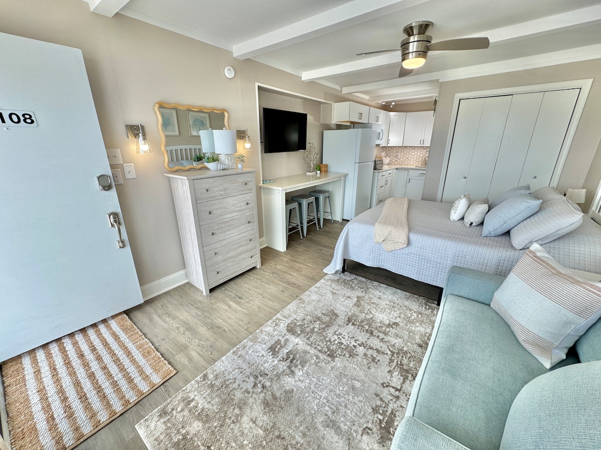 Wejdź do swojej nadmorskiej oazy! Ciesz się dobrze wyposażoną kuchnią, pełną łazienką i wygodą łóżka typu queen-size oraz futonu typu queen. Najbardziej komfortowo będzie się tu czuć maksymalnie trzy osoby dorosłe lub dwoje dorosłych z dwójką dzieci. Mamy dla Ciebie kawę, herbatę, pościel i ręczniki. Ciesz się szybkim internetem i telewizją kablową, aby zrelaksować się na plaży. Chociaż apartament nie oferuje widoku na ocean, plaża jest zaledwie kilka kroków dalej! Zarezerwuj teraz, aby przeżyć niezapomniany wypoczynek nad morzem. Spraw, aby nasze mieszkanie typu studio stało się Twoim domem z dala od domu.