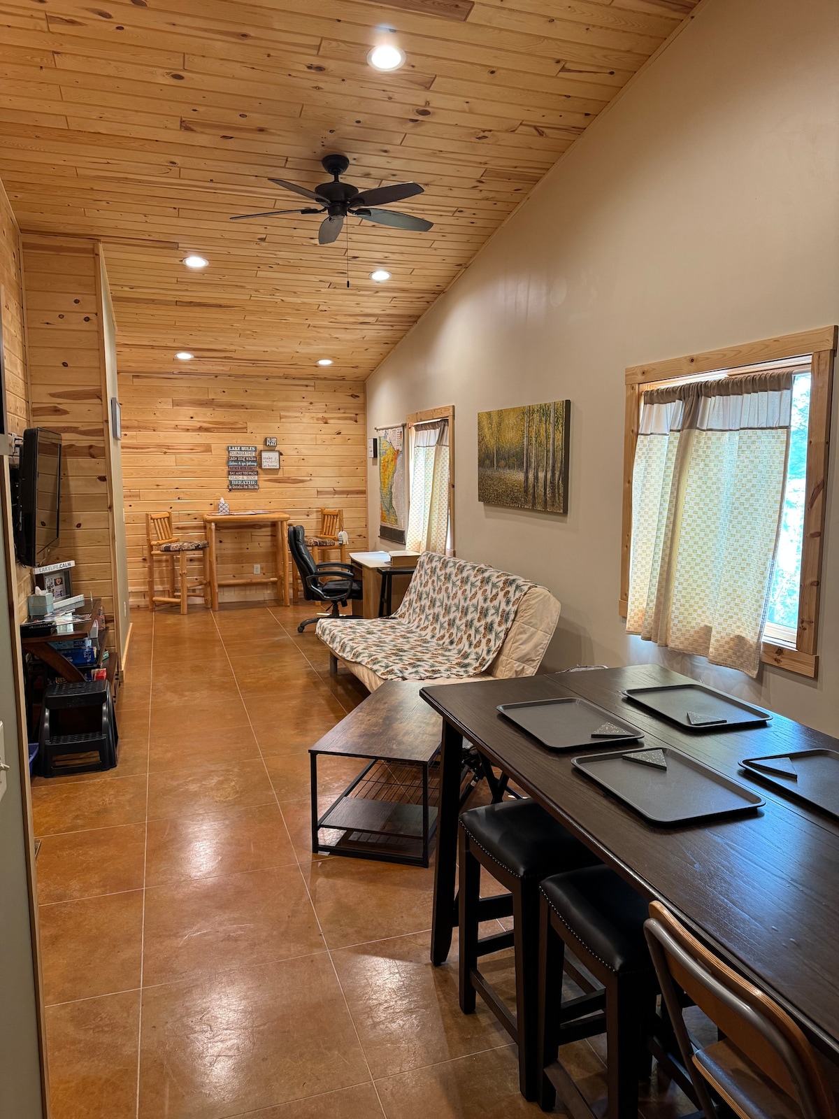 Take it easy at this unique getaway near Pierz Fish Lake. 3 bedrooms, 7 beds (2 beds in the loft) & 2.5 baths. 1 king bed, 2 queen beds, 4 twin beds. Hot tub. Fully screened in porch. Public access 2 miles away (4 min drive). Soo Line ATV/UTV & Snowmobile trail 1 mile away. Enjoy your time here year round with full heat & AC.