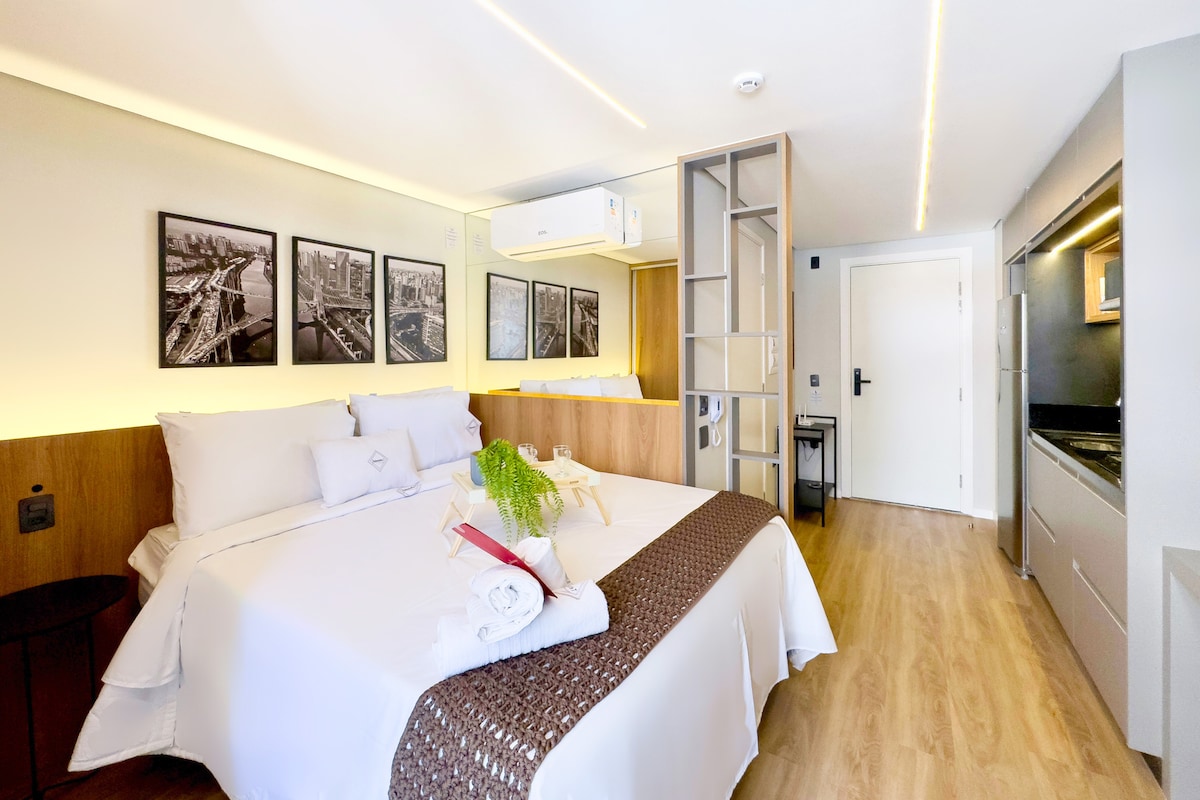 Wydajność i komfort w dynamicznym rytmie Brooklinu. Eleganckie, ciche i funkcjonalne studio, idealne dla osób podróżujących do São Paulo w interesach. Zamknięty balkon zintegrowany z przestrzenią, idealny na spotkania online lub chwile relaksu. Zaledwie kilka kroków od Brooklin Metro, z łatwym dostępem do głównych centrów biznesowych i lotniska Congonhas. Blisko rynków, restauracji i podstawowych usług w bezpiecznym, strategicznym obszarze.