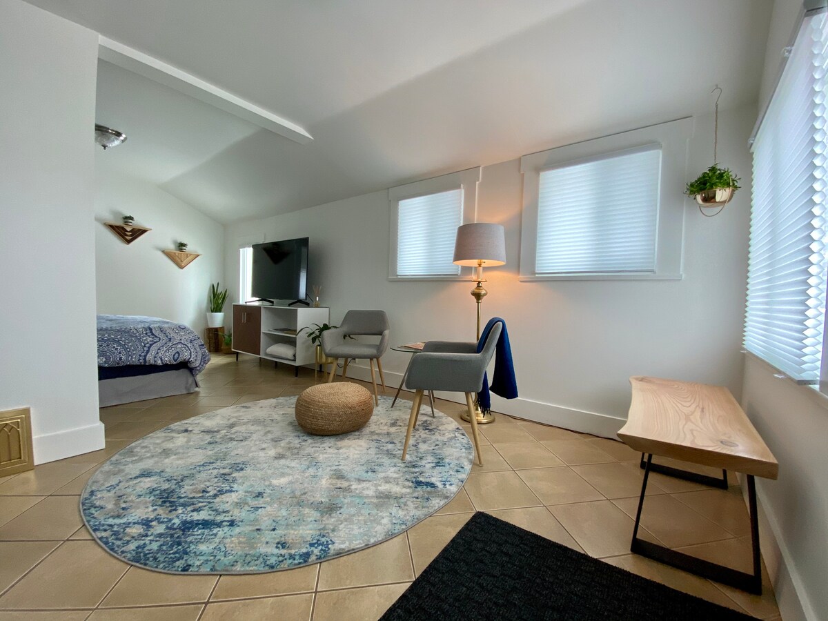 Ten nowo wybudowany prywatny apartament znajduje się z tyłu tego nowoczesnego domu górskiego z wyjściem na parter, prywatnym dziedzińcem i oddzielnym wejściem. W ciągu dnia będziesz cieszyć się dużą ilością naturalnego światła i niesamowitymi widokami na góry. Dokładnie wyposażony, ma pełną kuchnię, jadalnię i pralnię – wystarczy przynieść własne artykuły spożywcze, a poczujesz się jak w domu. W tym niesamowitym apartamencie znajdziesz mieszankę oryginalnej sztuki i historii Revelstoke, tak samo eklektyczną jak cały dom.