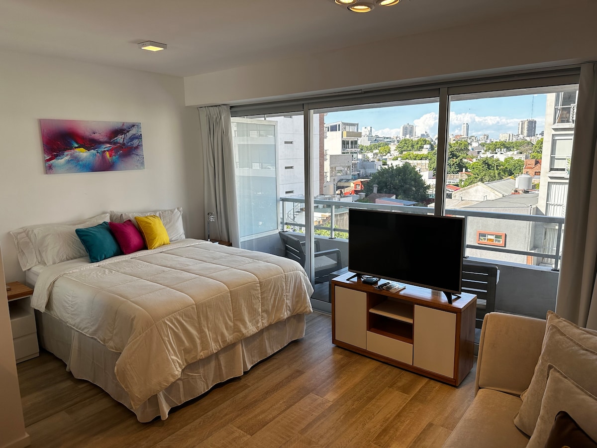Piękny apartament typu studio o powierzchni 34 m2 z balkonem z widokiem na ulicę i otwartym widokiem, w samym sercu Palermo Queens. Wi-Fi światłowodowe. Całodobowa ochrona, sezonowy basen z podgrzewaną wodą, siłownia i sala gier. Idealne: osoby podróżujące w pojedynkę lub pary. Bardzo blisko Plaza Serrano, Movistar Arena i linii metra B. Obszar z restauracjami, barami, kawiarniami i outletami.