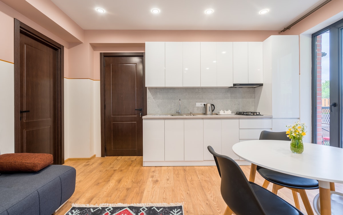 Apartament znajduje się w dzielnicy mieszkaniowej Vera, w pobliżu tętniącej życiem sceny słynnego hotelu Rooms i Stamba. Jest położone w sadzie, zapewniając spokojne, a jednocześnie centralne miejsce zamieszkania. Chętnie podamy Ci pyszczące gruzińskie śniadanie za dodatkową opłatą, przygotowane na świeżo w Nana's Kitchen. Apartament ma wszystko, czego potrzebujesz, w tym dobrze wyposażoną kuchnię i widok na podwórko pełne drzew owocowych. To idealne miejsce na relaks w domu lub w ogrodzie, po przyjemnym dniu zwiedzania Tbilisi.