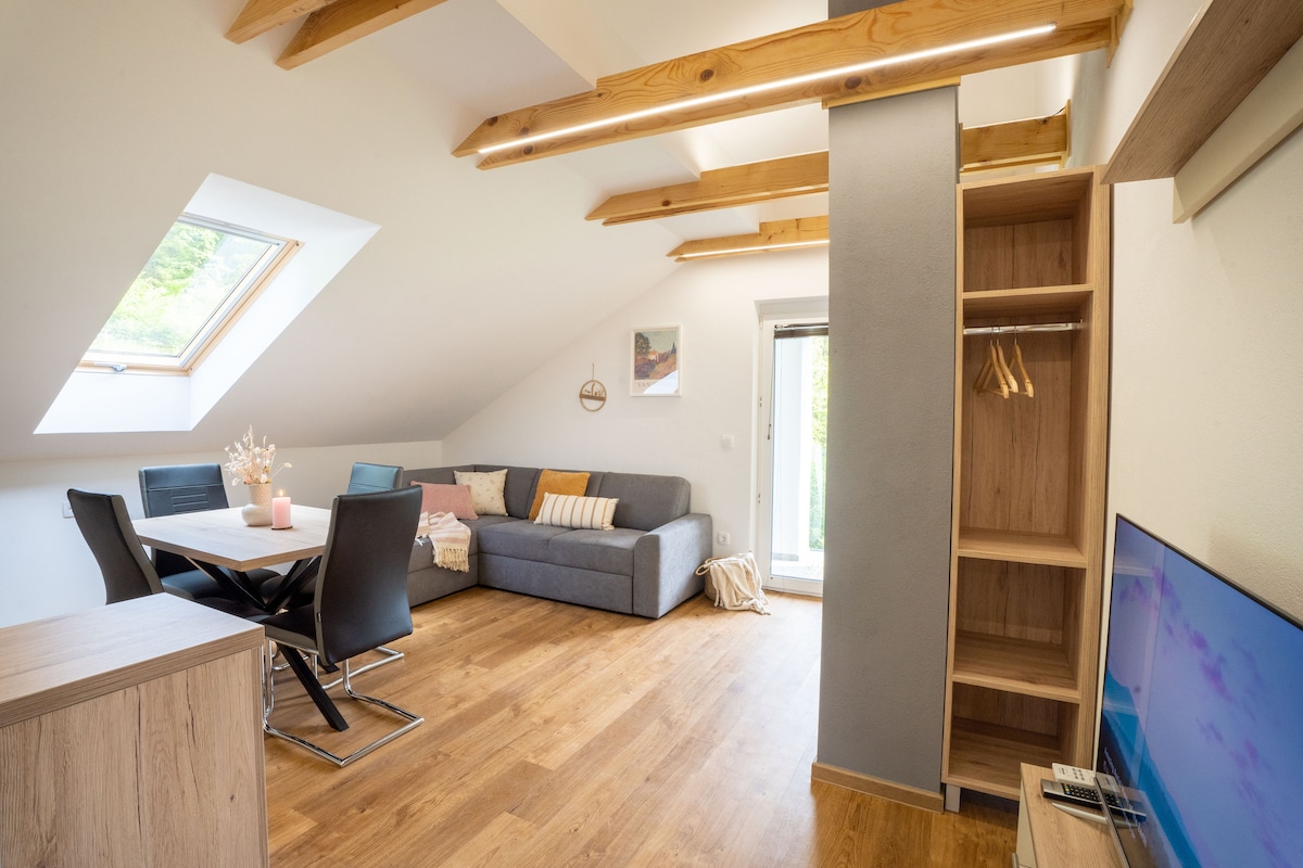 W spokojnej wiosce 5 minut od Bled. Pięknie zaprojektowana nowoczesna przestrzeń z zieloną okolicą to idealna baza wypadowa do zwiedzania i uprawiania sportu. W odległości 100 m znajduje się sklep spożywczy i przystanek autobusowy z bezpośrednimi połączeniami z Bled i Bohinj. Mieszkanie ma własne wejście z bezpłatnym parkingiem. Obejmuje on jedną sypialnię, łazienkę oraz kuchnię połączoną z salonym, w którym w razie potrzeby znajduje się rozkładana sofa. Z mieszkania jest wyjście na taras, z którego roztaczają się wspaniałe widoki.