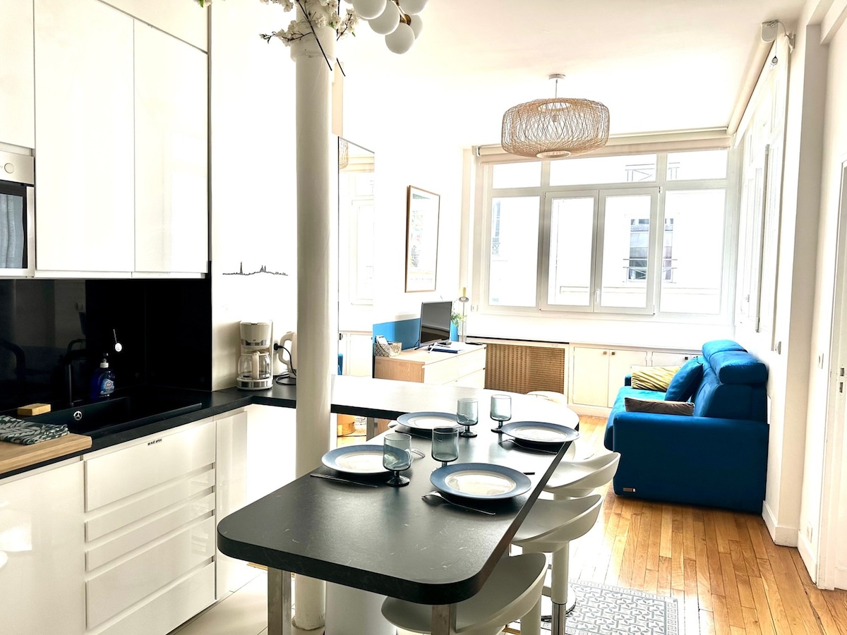 Appartement climatisée de 60 m2 à l’agencement haut de gamme dans l’hyper centre de Paris quartier historique de Montorgueil, célèbre pour ses commerces de bouches, ses petits bistrots et restos. L’appartement se situe au 1 er étage d’un immeuble dans une rue très calme. Il a été refait à neuf en 2023 par une célèbre architecte et donc très bien agencé avec des équipements de très haut standing. Vous y serez comme dans une suite d’hôtel avec le charme en plus, d’un vrai logement parisien.
