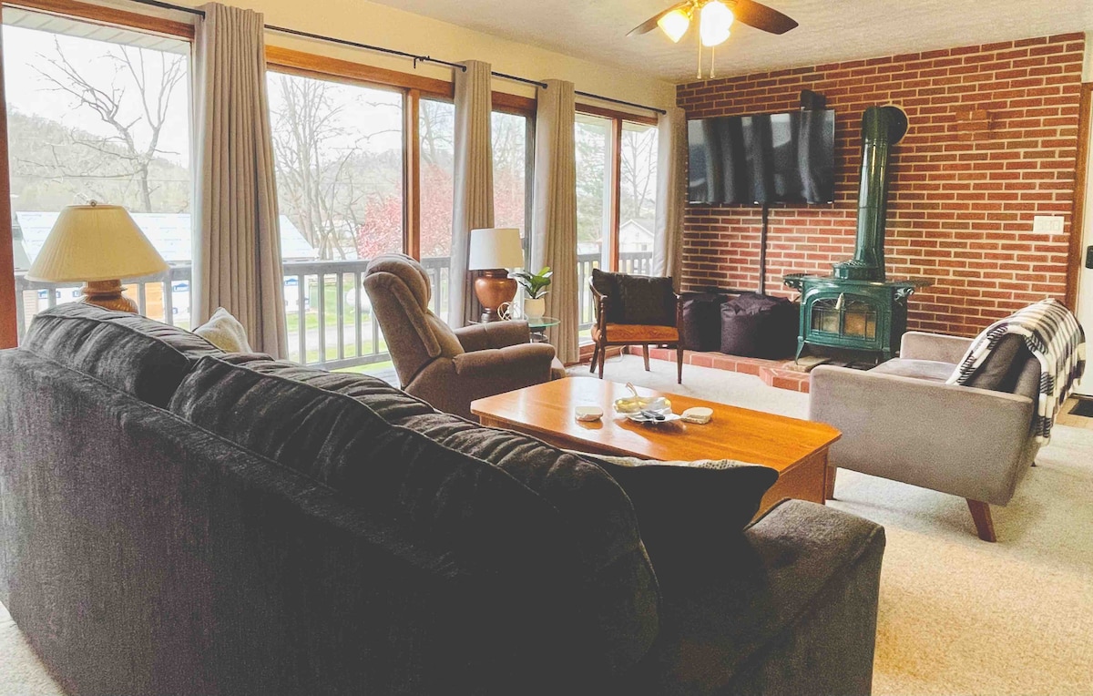 Zapomnij o swoich zmartwieniach dzięki tym przestronnym i napawającym spokojem wnętrzom. Położony na wzgórzach Nashport Ohio. Zrelaksuj się w jacuzzi, zgromadź się wokół ognia lub gotuj na tarasie. Wewnątrz znajduje się duży, otwarty salon z pełnym widokiem na las, dużo miejsc do siedzenia, jadalnia, w pełni zaopatrzona kuchnia, 3 przytulne sypialnie i mały pokój z łóżkiem piętrowym. Nasz dom znajduje się zaledwie kilka minut od parku stanowego i kempingu Dillon, kempingu Lazy Acres i rezerwatu przyrody Black Hand Gorge. Położony między Newark i Zanesville.