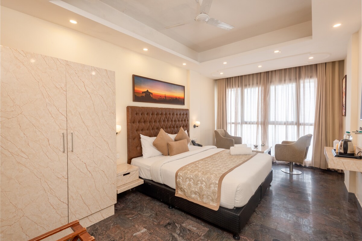 Just 350 meters from Mussoorie’s Mall Road, our Valley View Room offers comfort and convenience. Enjoy a king-size bed, private balcony with stunning Himalayan vistas, modern amenities like a Smart TV, mini-fridge, electronic safe, and tea/coffee maker. The room features hot/cold AC, a sit-out area, and a spacious bathroom with premium amenities. The property includes free drive-in parking and an on-site restaurant, perfect for families, couples, and solo travelers.